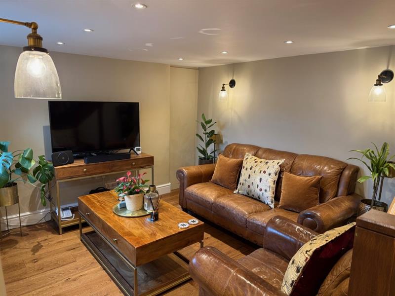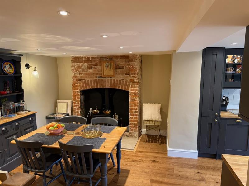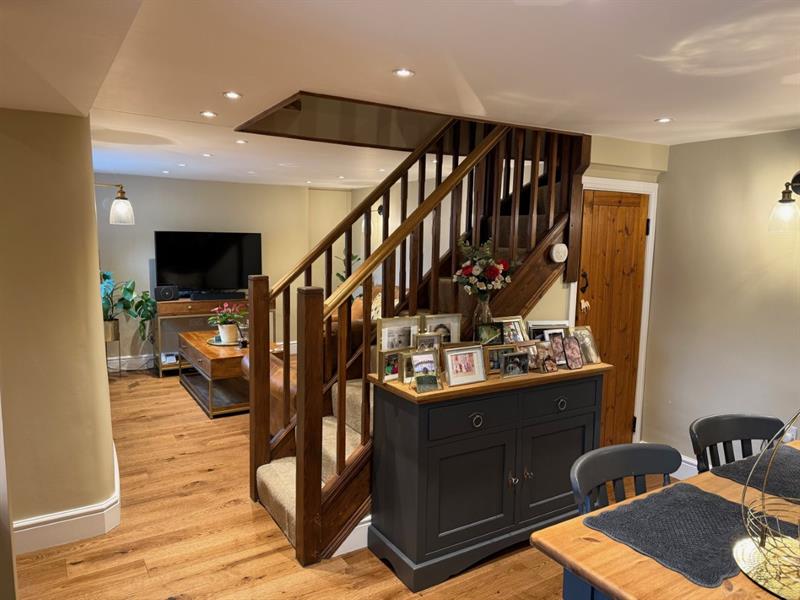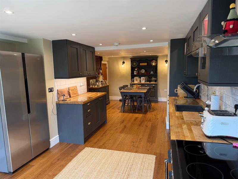 The ground floor living space is entirely open plan with three defined areas: sitting room, dining room with exposed brick fireplace with inset LPG gas stove and a stylish contemporary kitchen. In addition, there is a generous entrance lobby with cloakroom and a good size utility room off the kitchen. The first floor offers three bedrooms and a family bathroom off a spacious landing.